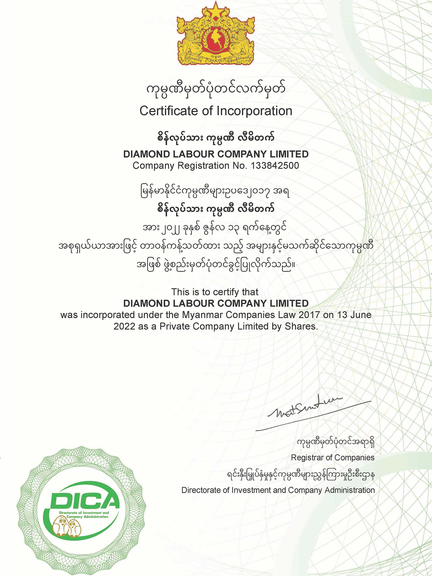 We “Diamond Labour Company Limited.” is one of the most efficient registered staff recruitment and training agencies in Myanmar. Our Company, Diamond Labour, is registered in June 2022. Company Update Licence Number (332/2024) is issued by the Department of Labour of the Ministry of Labour. Our partners who challenge dreams and build the future together with us. We recuit efficent or non-efficent employees from Myanmar with the specific need of business in Thailand, Singapore, Malaysia. Our meticulous selection process considers specialized skills, language proficiency and cultural understanding, ensuring an optimal match for each job placement.